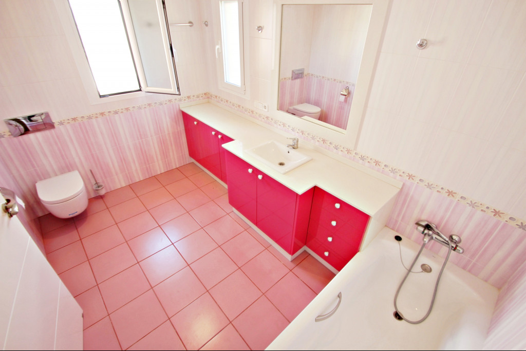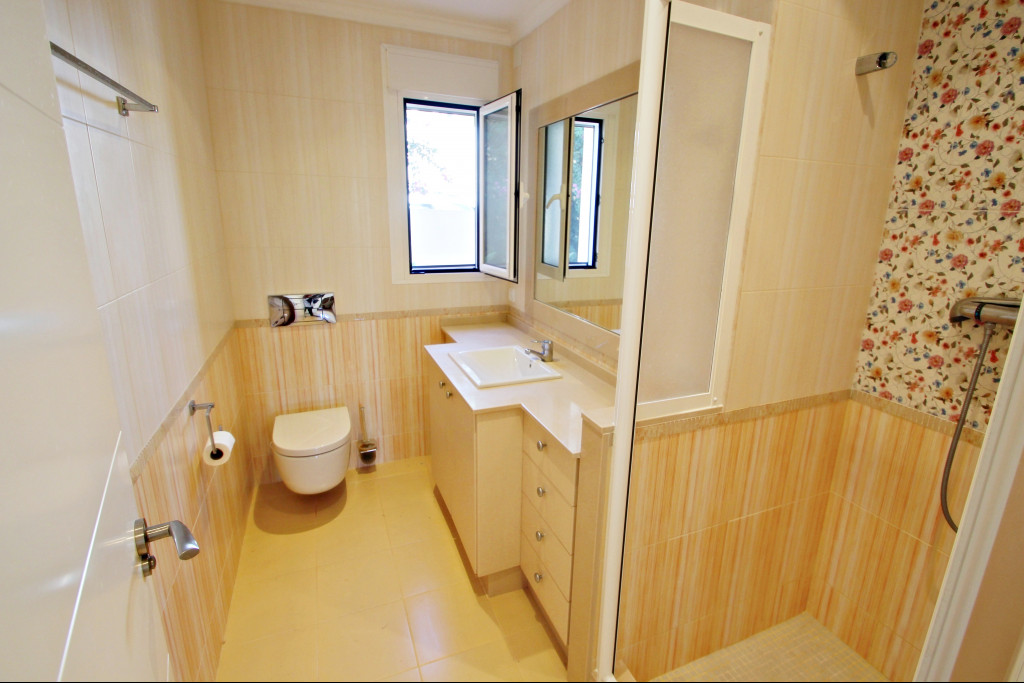The villa is built on three levels, but it is accessed without internal stairs through the middle floor, where you will find 2 double bedrooms with 2 bathrooms in suite, a large living room with access to the pool and the garden, a pleasant dining room with large glass windows that let the daylight enter throughout the house.