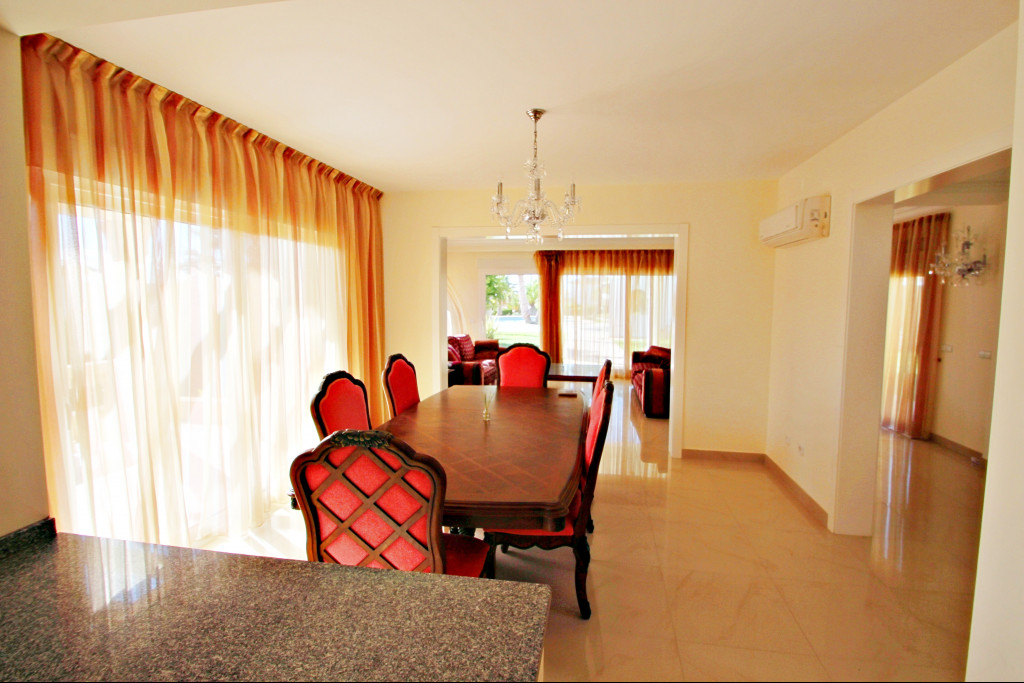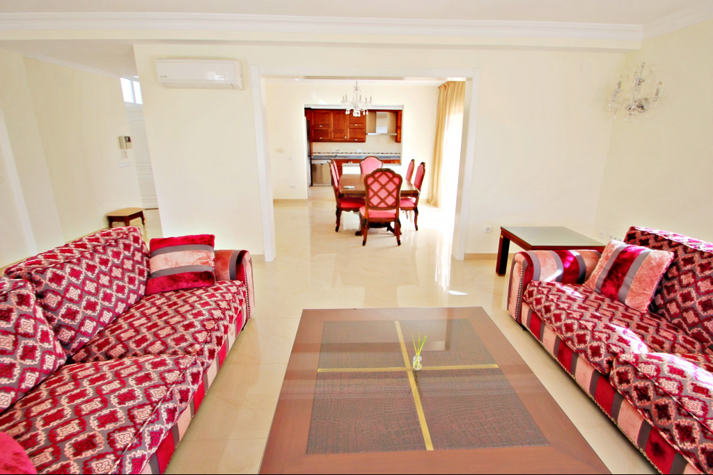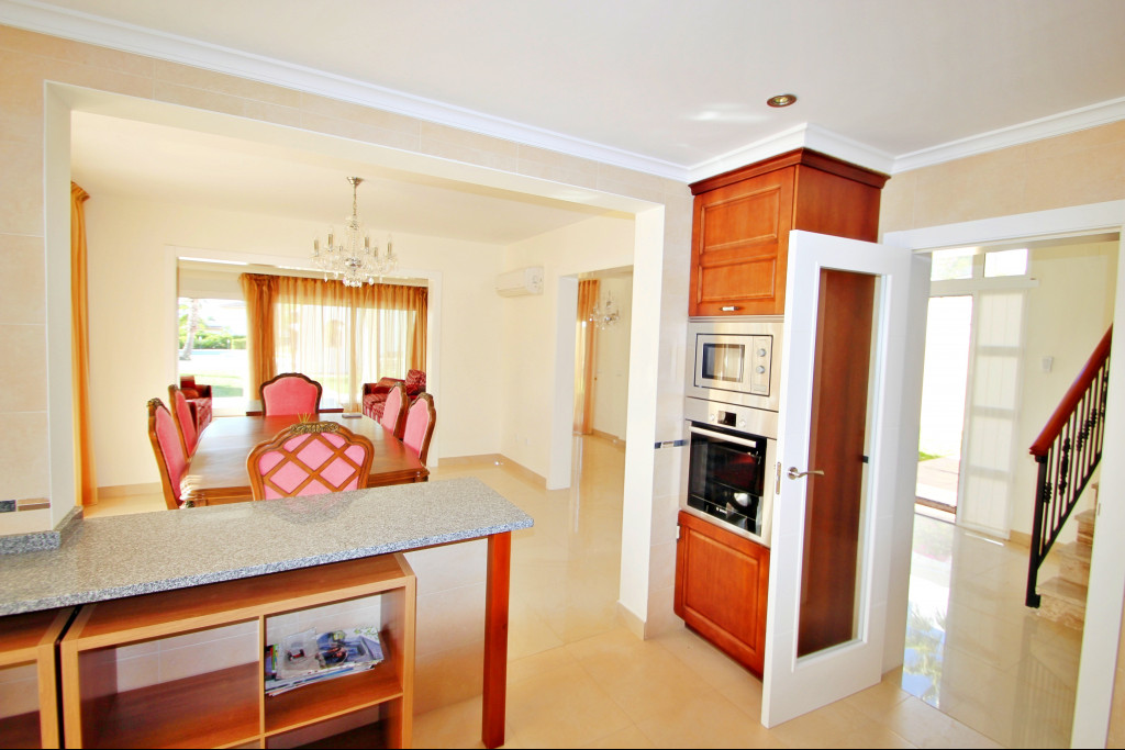 The house is equipped with underfloor heating throughout the house, A/C in all rooms, an alarm system and the interiors are decorated in a modern style with large windows, letting in daylight, filling the rooms with an excellent atmosphere and good energy. The living room, which forms the heart of the house, is very spacious and bright, from where you can access a covered terrace with views to the large pool, the barbecue and the beautiful tropical garden with an automatic irrigation system. On the other side of the living room which is open, there is the dining room next to the opened kitchen furnished with high-quality modern furniture and at the back is a storeroom with a washing machine.